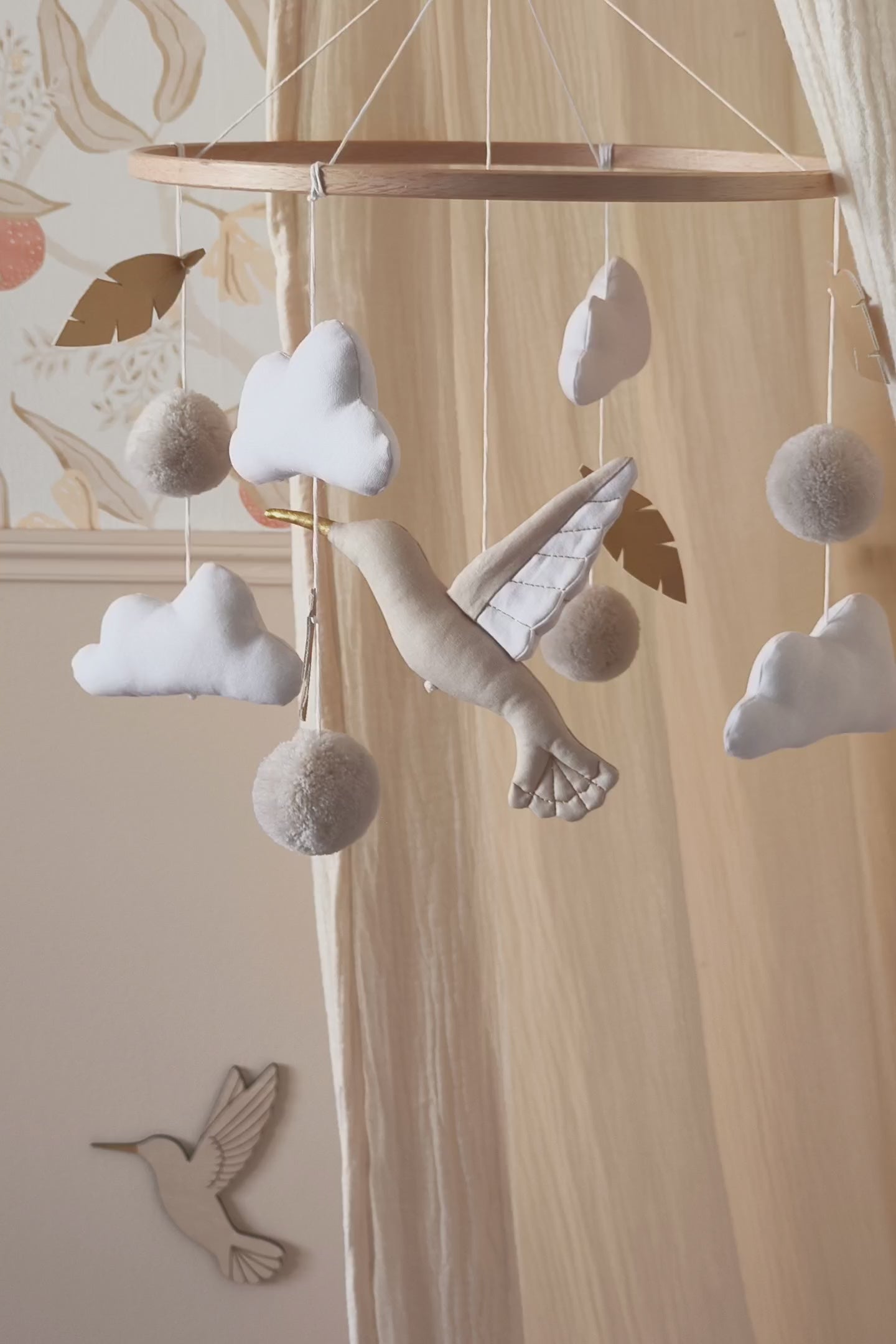 Ce mobile est composé de 4 nuages en coton rembourrés de polyester 100% recyclé, 4 plumes dorées, 1 Colibri et 4 pompons, le tout monté sur un support en bois FSC.