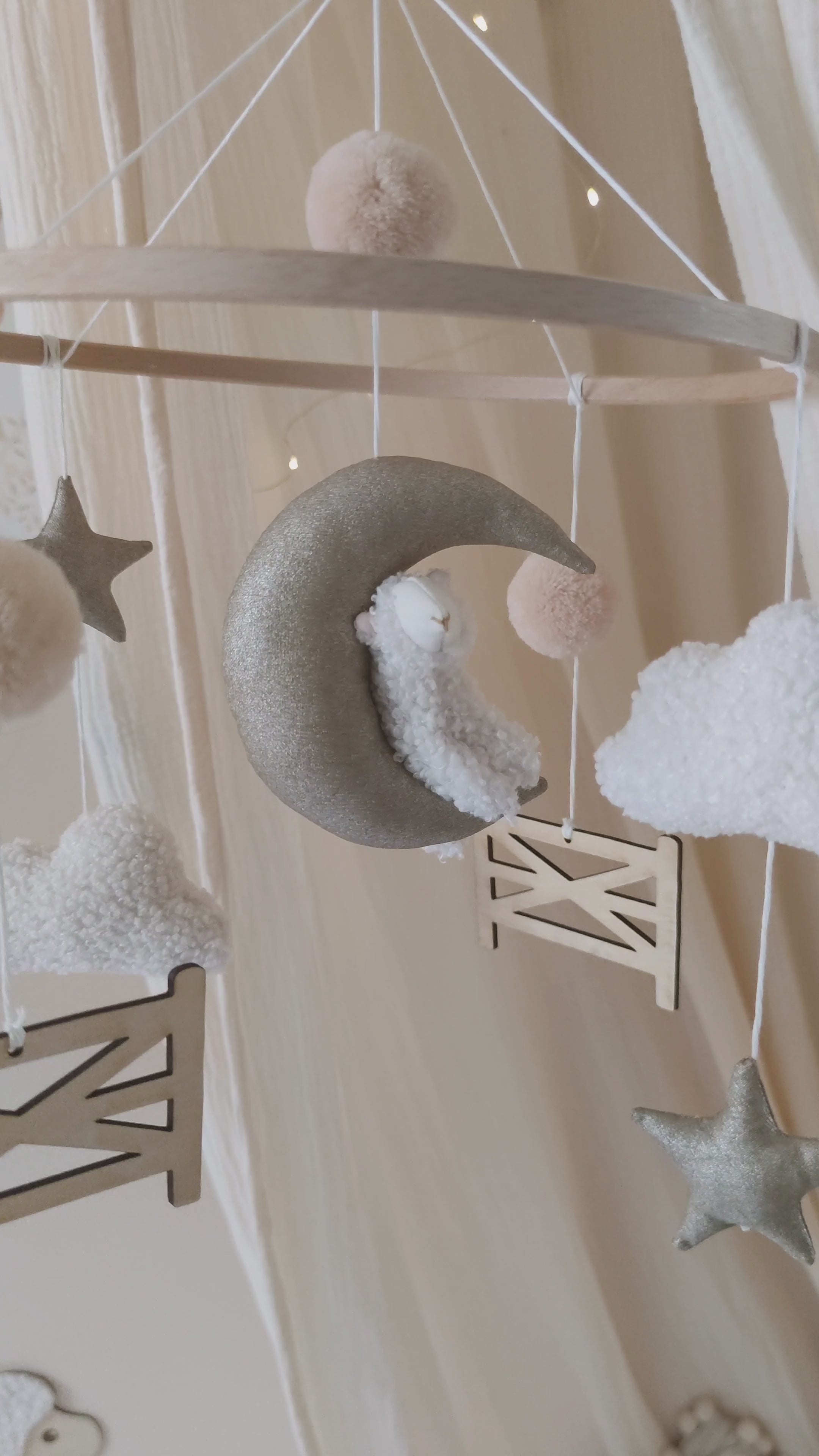 Ce mobile est composé de 1 agneau, 1 lune, 2 nuages et 2 étoiles en coton rembourrés de polyester 100% recyclé, 2 barrières en bois, 3 pompons, le tout monté sur un support en bois FSC.