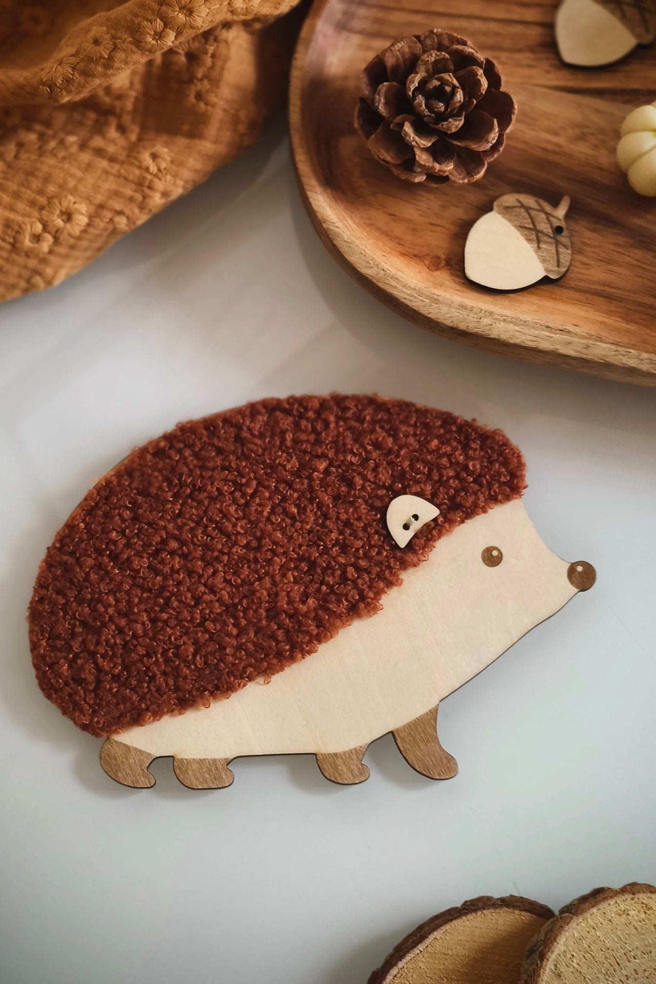 Cette décoration représente un petit hérisson en bois et tissu bouclettes.