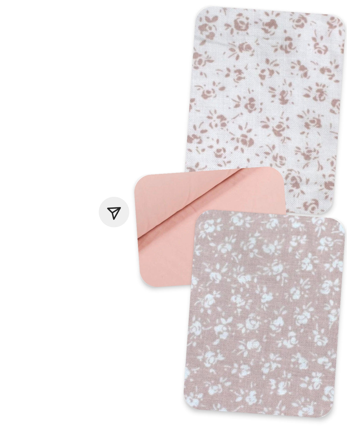 ♥ Coloris et Tissus du modèle en photo : Rose clair uni, Fleurs vieux rose, Petites fleurs rose fond blanc, Blanc uni + Pompons rose poudré.